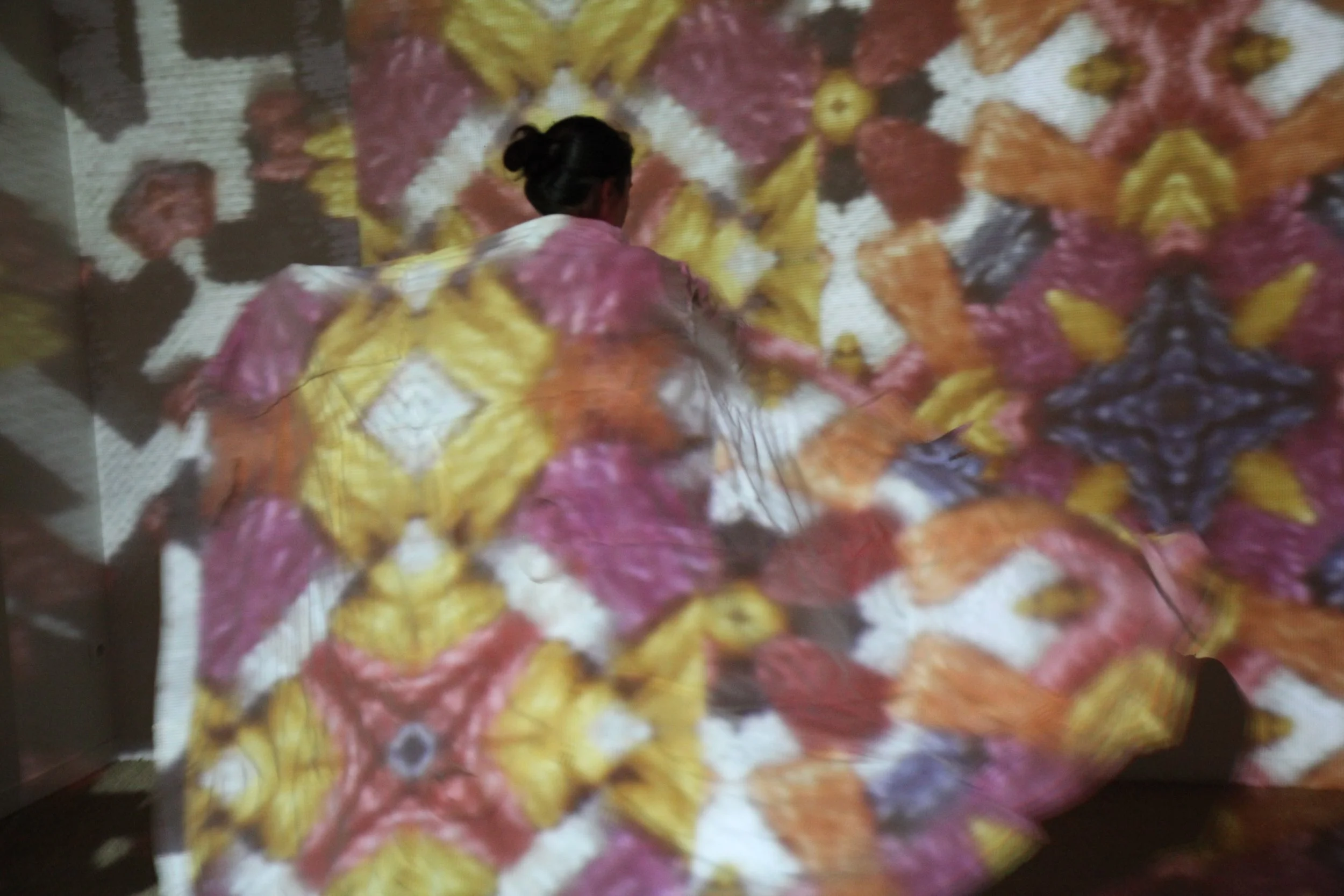 Grâce au numérique, nos recherches en maille et broderie, passées au prisme d’un kaléidoscope, deviennent une source infinie de nouveaux motifs. Ces motifs sont multipliés et rythmés par le son remixé des « bruits de l'atelier », donnant lieu à des installations vidéo où le spectateur devient acteur.
